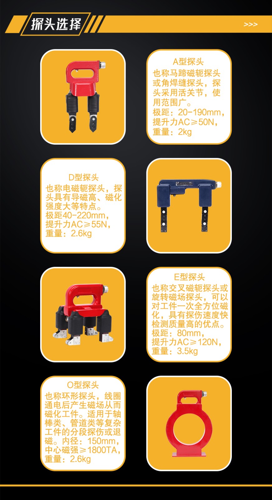 (2)D型探頭:也稱電磁軛探頭,探頭具有導(dǎo)磁高、磁化強(qiáng)度大等特點。極距40mm—220mm,提升力AC≥55N,重量:2.6kg;