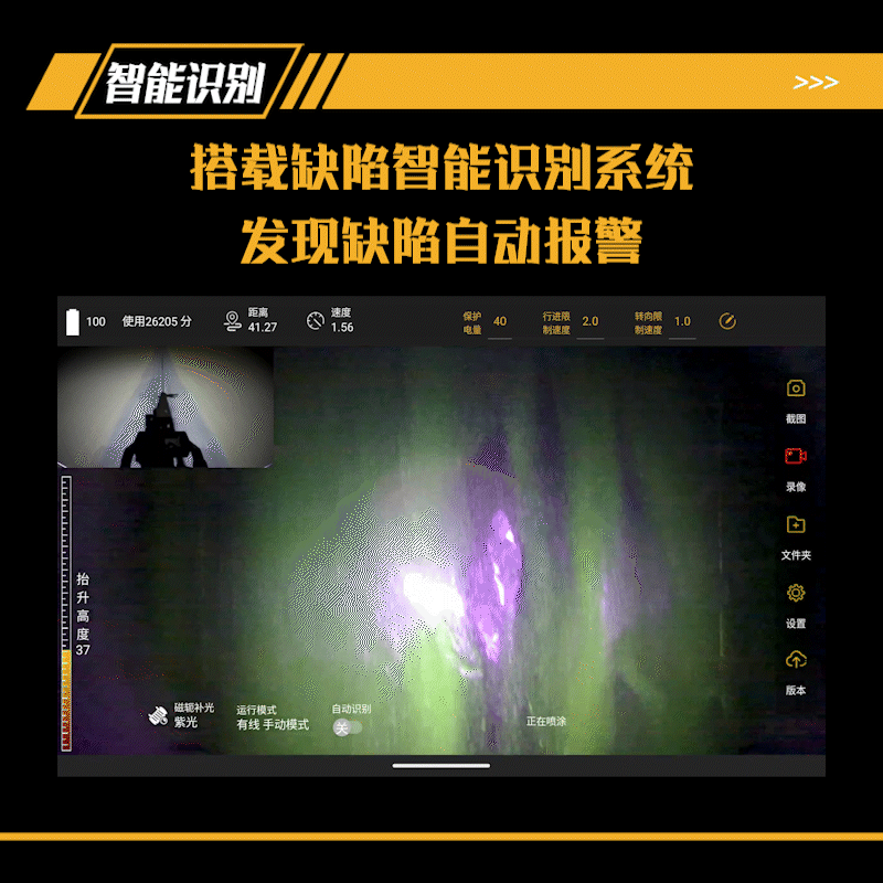 集成無線、有線兩種供電與控制方式控制機(jī)器人運動和檢測,遙控器端集成高清彩色屏幕,能夠?qū)崟r查看檢測區(qū)域及行進(jìn)方向前側(cè)的圖像信息,并且機(jī)器人搭載高精度浮動升降平臺,能夠?qū)崿F(xiàn)檢測過程中磁軛的自適應(yīng)。適用于大型壓力容器、儲罐等設(shè)備磁粉自動化檢測。