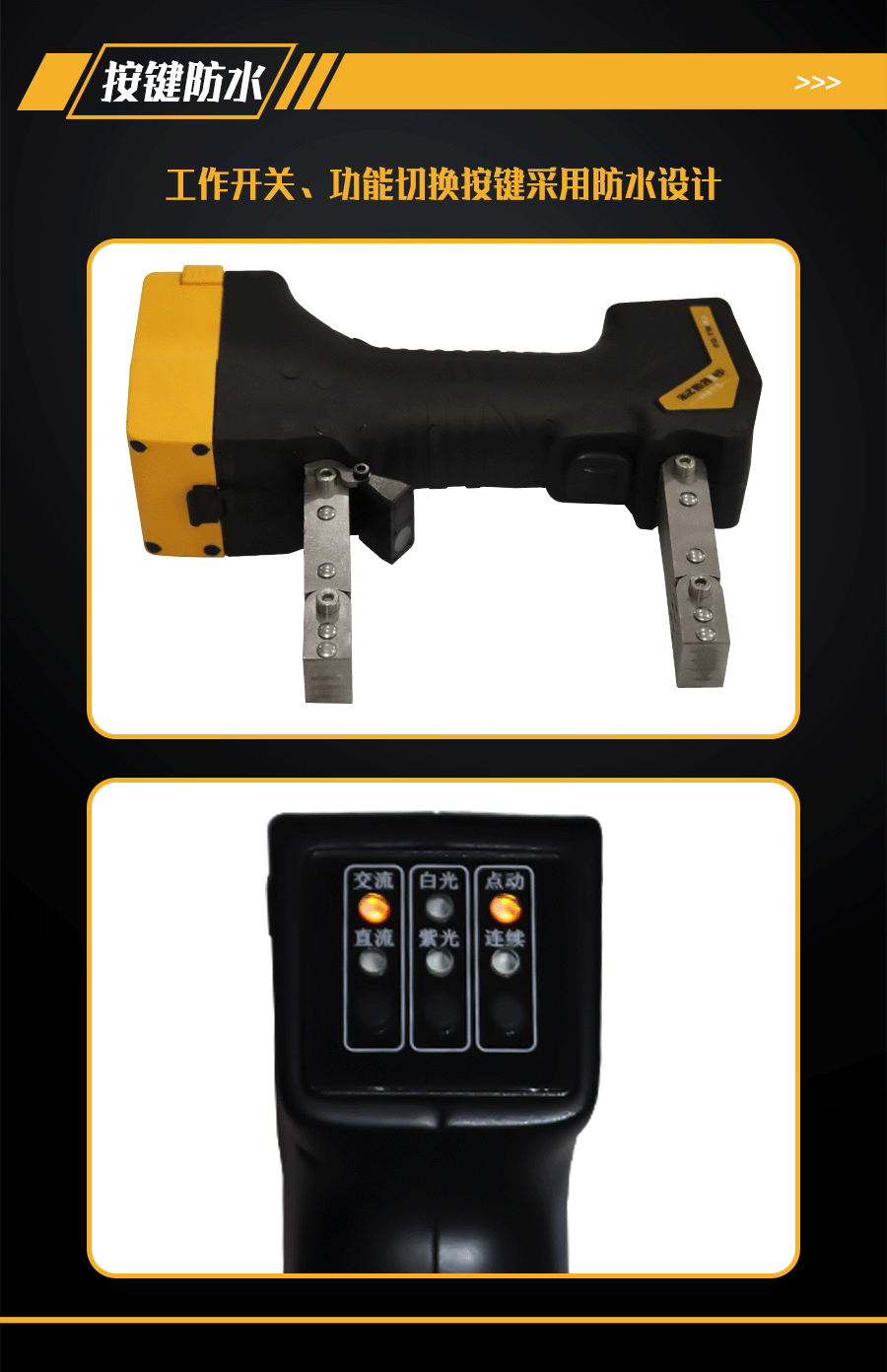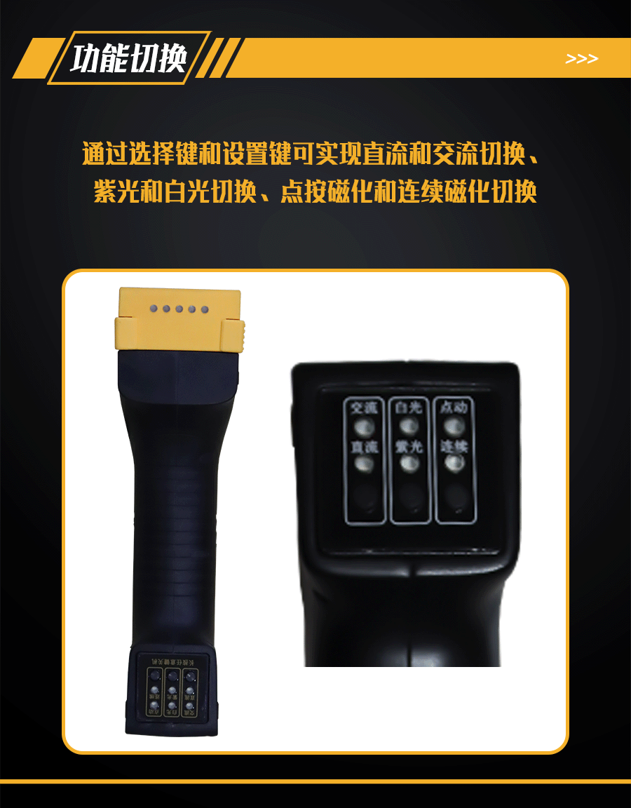 4.磁軛配有防水防油磁化按鍵和交直流、黑白光功能、點按和連續(xù)磁化切換按鍵。
