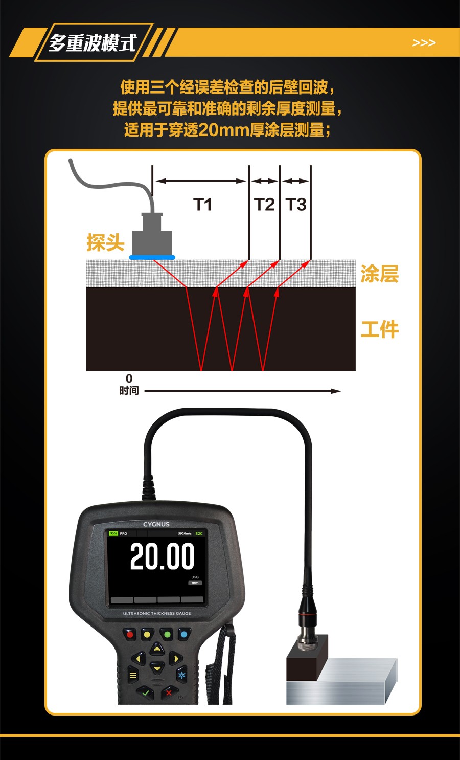 (3)多重波模式使用三個經(jīng)誤差檢查的后壁回波,提供最可靠和準確的剩余厚度測量,無需去除涂層(厚度達20mm);(單晶探頭)