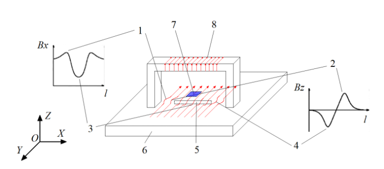 1-電流在裂紋兩端聚集時,Bx出現(xiàn)凸起;2-電流在裂紋尖端順時針旋轉(zhuǎn)時,Bz出現(xiàn)波峰;3-電流從裂紋底部通過時,Bx出現(xiàn)波谷;4-電流在裂紋尖端逆時針旋轉(zhuǎn)時,Bz出現(xiàn)波谷;5-缺陷;6-待檢工件;7-傳感器;8-激勵線圈。