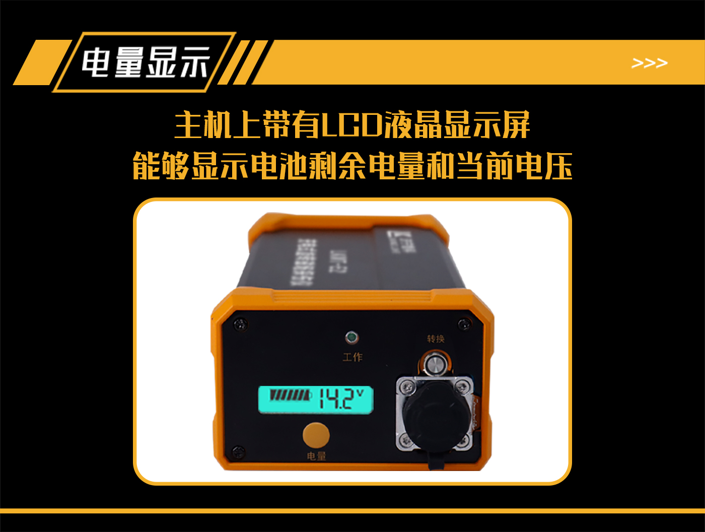 4、儀器主機(jī)帶有LCD顯示屏及操作按鍵,可顯示剩余電量和電壓;鋰電池電源帶有電量指示燈;