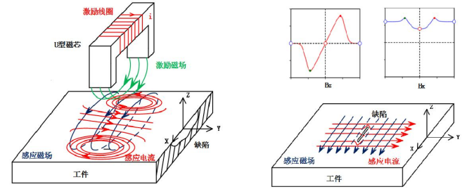 交流電磁場檢測(簡稱ACFM)技術(shù),其工作原理是激勵線圈在工件中感應(yīng)出均勻的交變電流,感應(yīng)電流在裂紋、腐蝕等缺陷位置產(chǎn)生擾動,基于電場擾動引起空間磁場畸變原理,利用檢測傳感器捕獲空間磁場畸變信號,從而實現(xiàn)缺陷的檢測與評估。