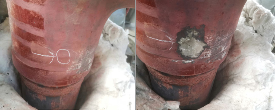 高溫蒸汽閥門應(yīng)用過程中存在異常,使用ACFM技術(shù)進(jìn)行在役檢測,通過限流方式控制閥門溫度低于350℃,進(jìn)行檢測。檢測過程發(fā)現(xiàn)多處缺陷,以表面裂紋與內(nèi)部孔砂孔為主,檢測結(jié)果經(jīng)過打磨得以驗(yàn)證,如圖5、6所示。